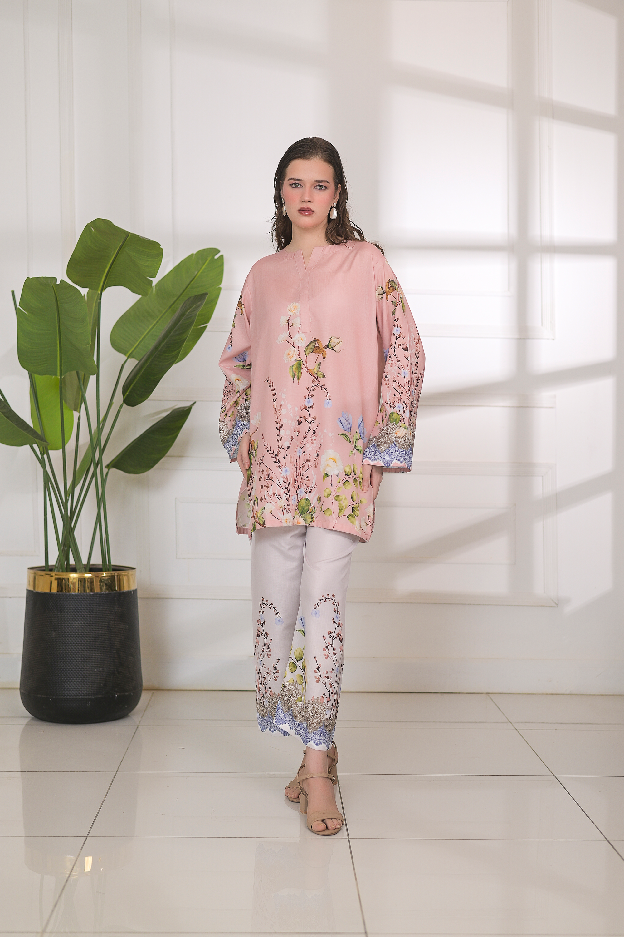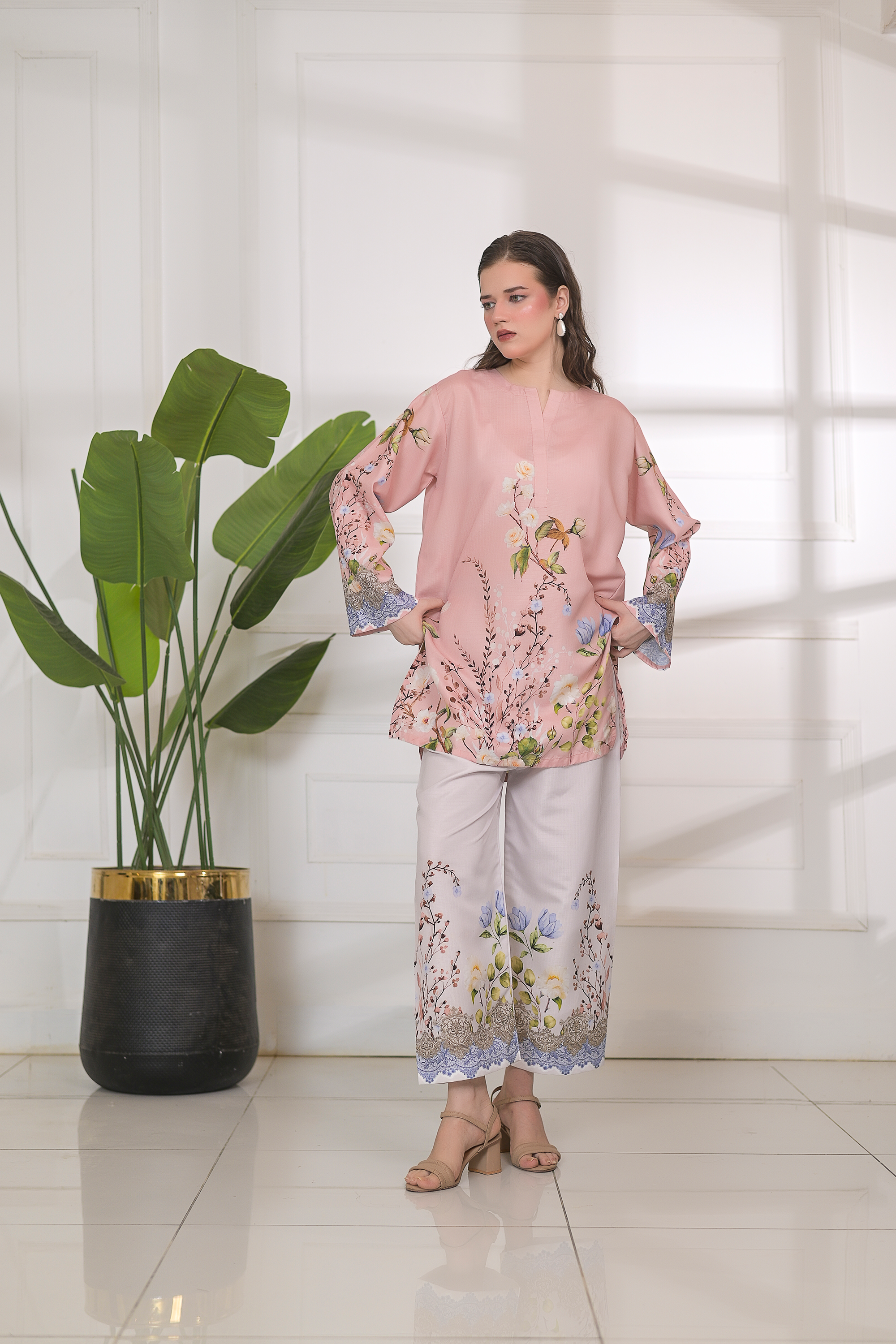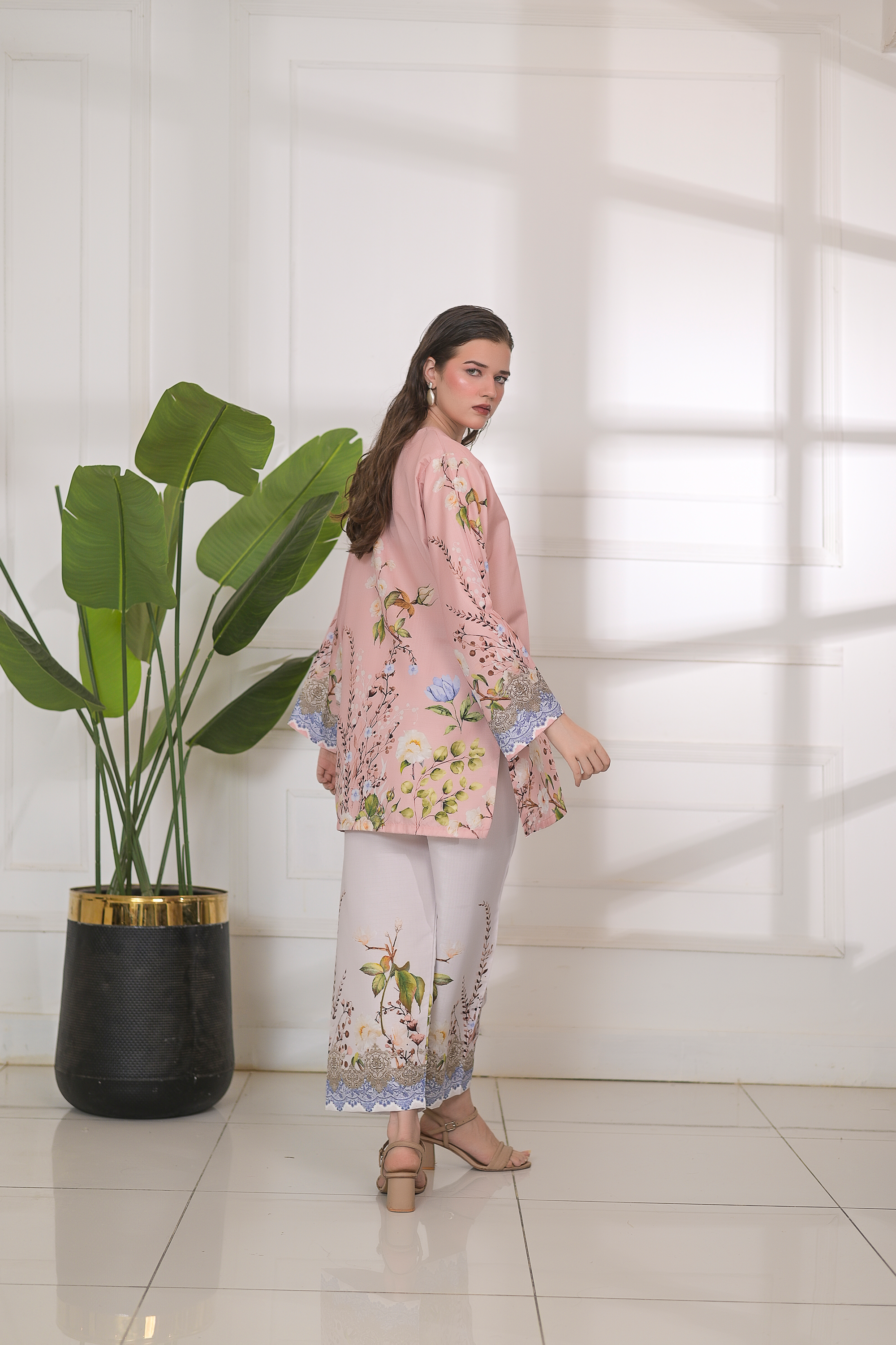 Embrace the quiet romance of a garden at twilight with our Dusky Rose 2-piece suit crafted from soft poly lawn. This elegant ensemble features a sophisticated dusky rose kurta paired with chic ivory trousers, both adorned with an artistic botanical print of delicate florals and a sweet songbird. A distinctive periwinkle-blue border adds a final touch of artistry to the sleeves and trouser hems, creating a look of timeless femininity ideal for brunches, intimate gatherings, and any event calling for graceful style.