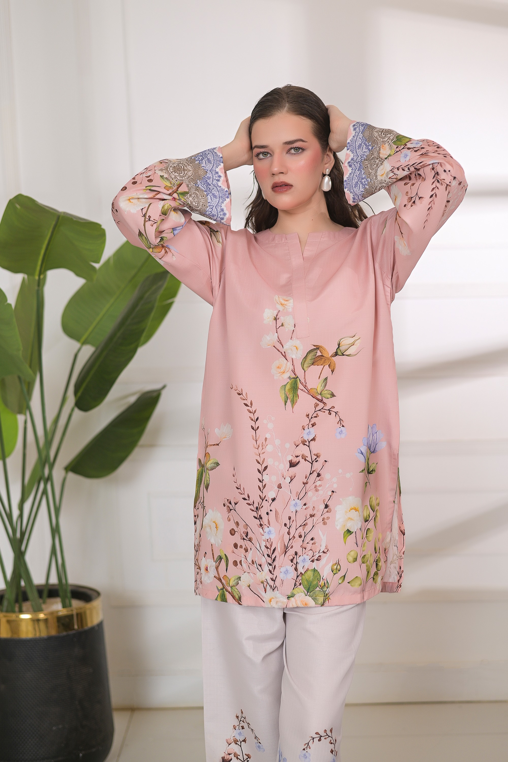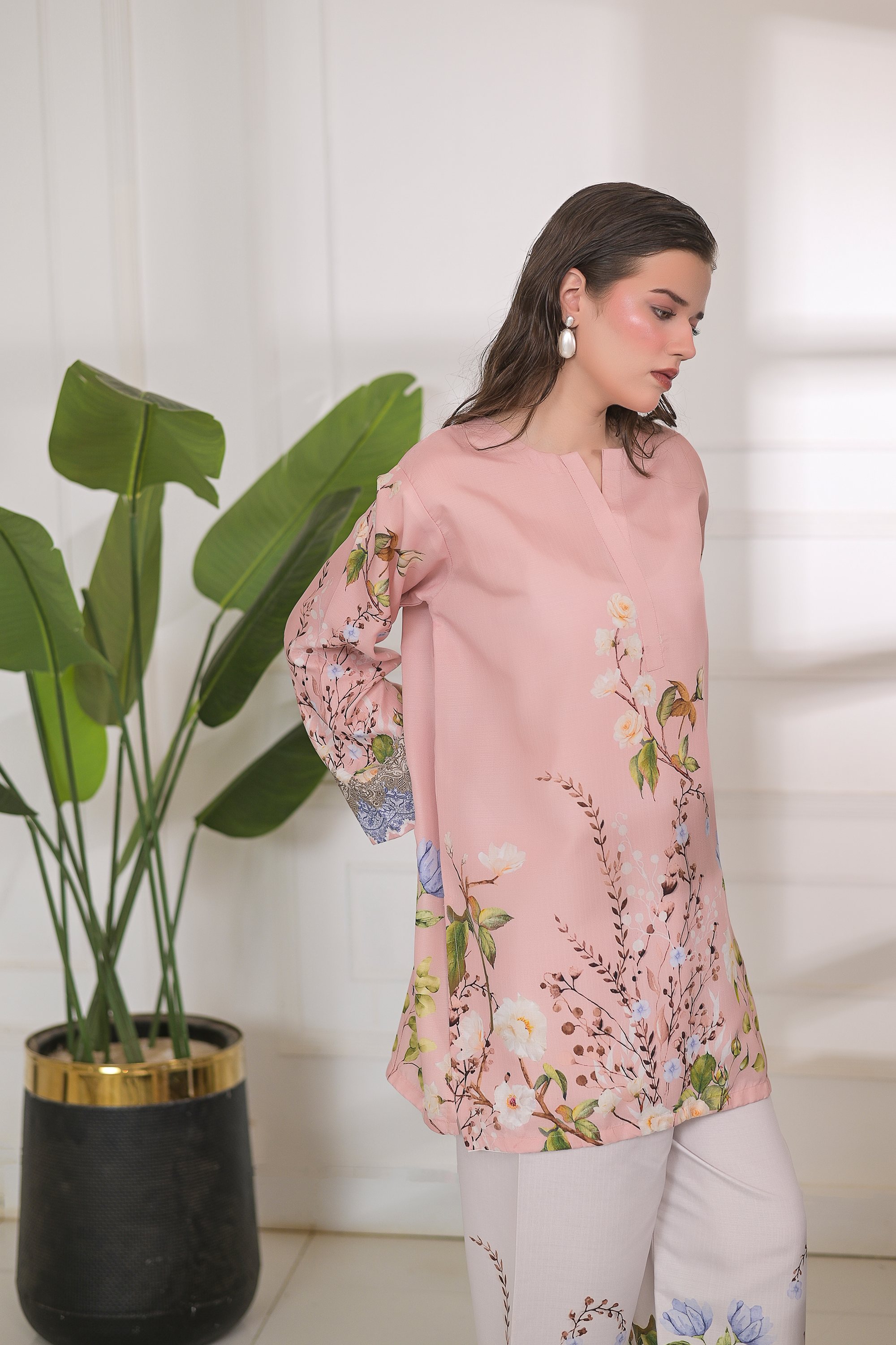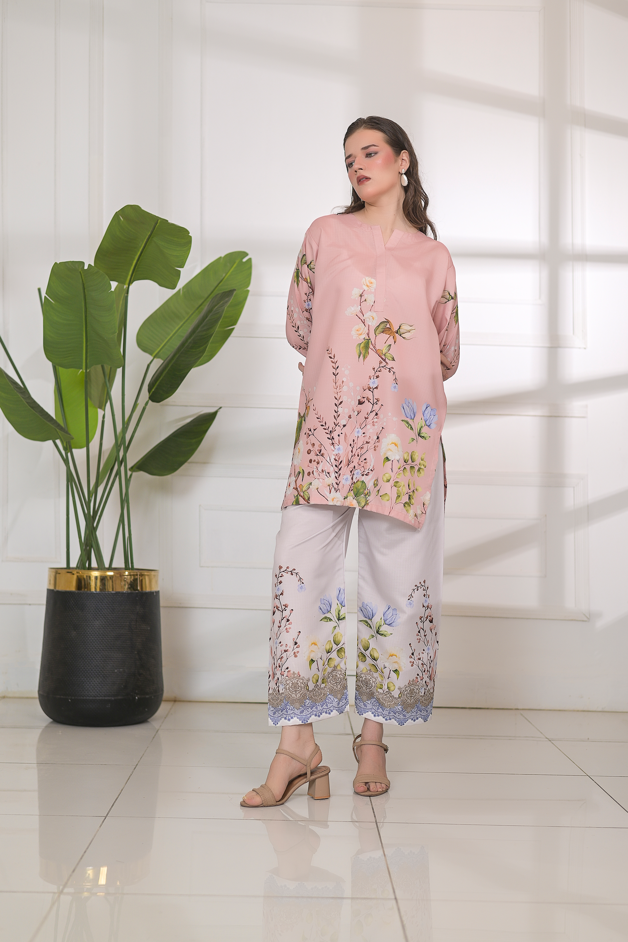 Embrace the quiet romance of a garden at twilight with our Dusky Rose 2-piece suit crafted from soft poly lawn. This elegant ensemble features a sophisticated dusky rose kurta paired with chic ivory trousers, both adorned with an artistic botanical print of delicate florals and a sweet songbird. A distinctive periwinkle-blue border adds a final touch of artistry to the sleeves and trouser hems, creating a look of timeless femininity ideal for brunches, intimate gatherings, and any event calling for graceful style.