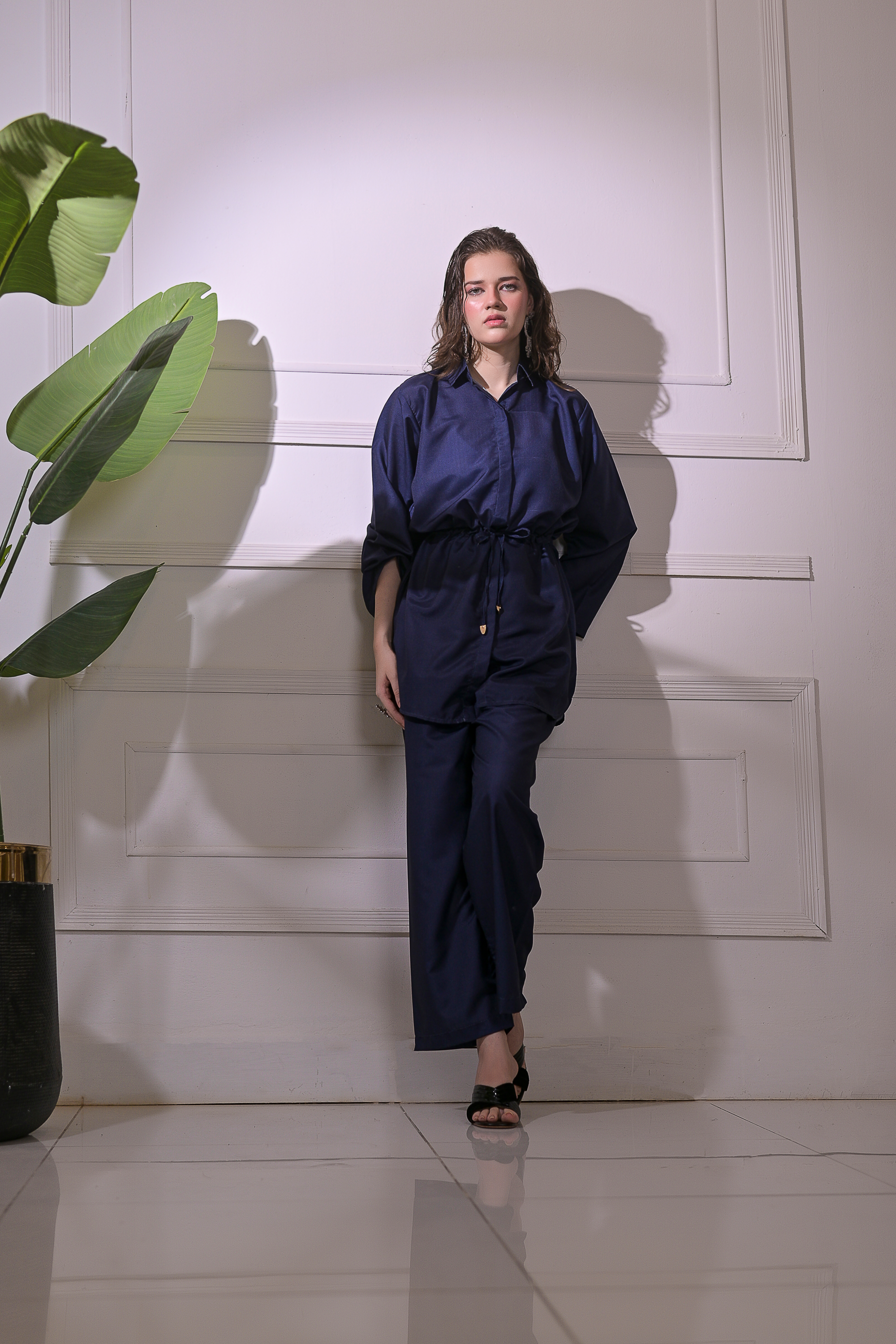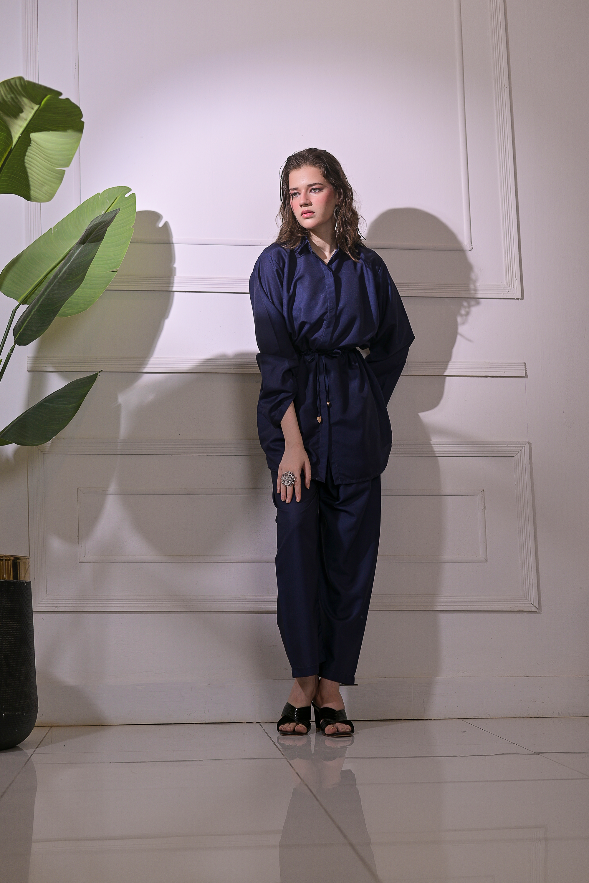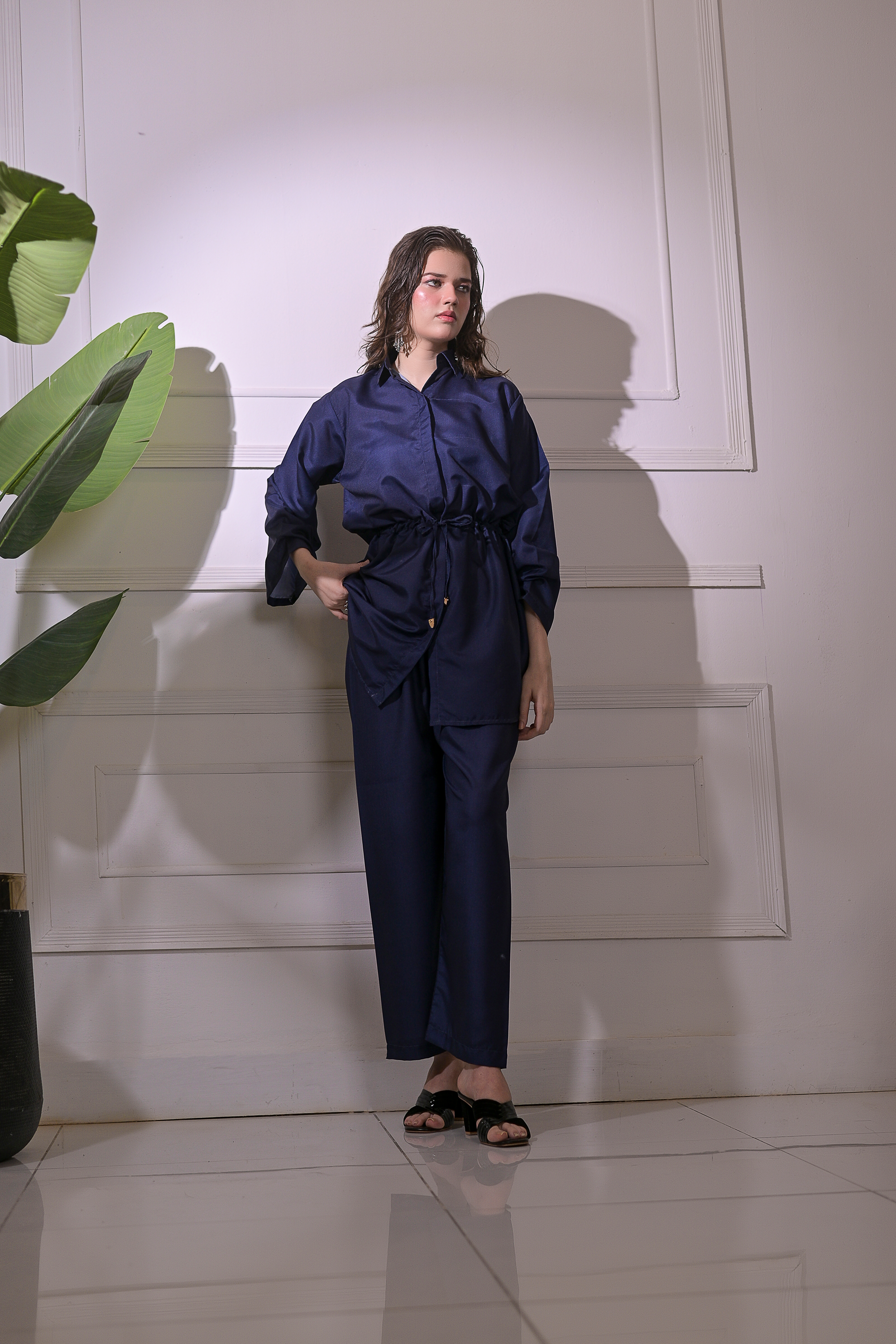 Radiate calm confidence with Ocean Whisper, a refined 2-piece stitched suit tailored from premium blended linen. The deep navy tone exudes sophistication, while the adjustable drawstring waist and straight-fit trousers ensure a flattering, effortless silhouette. Perfect for smart casual outings or elegant everyday wear, this ensemble blends comfort, grace, and modern minimalism in perfect harmony.