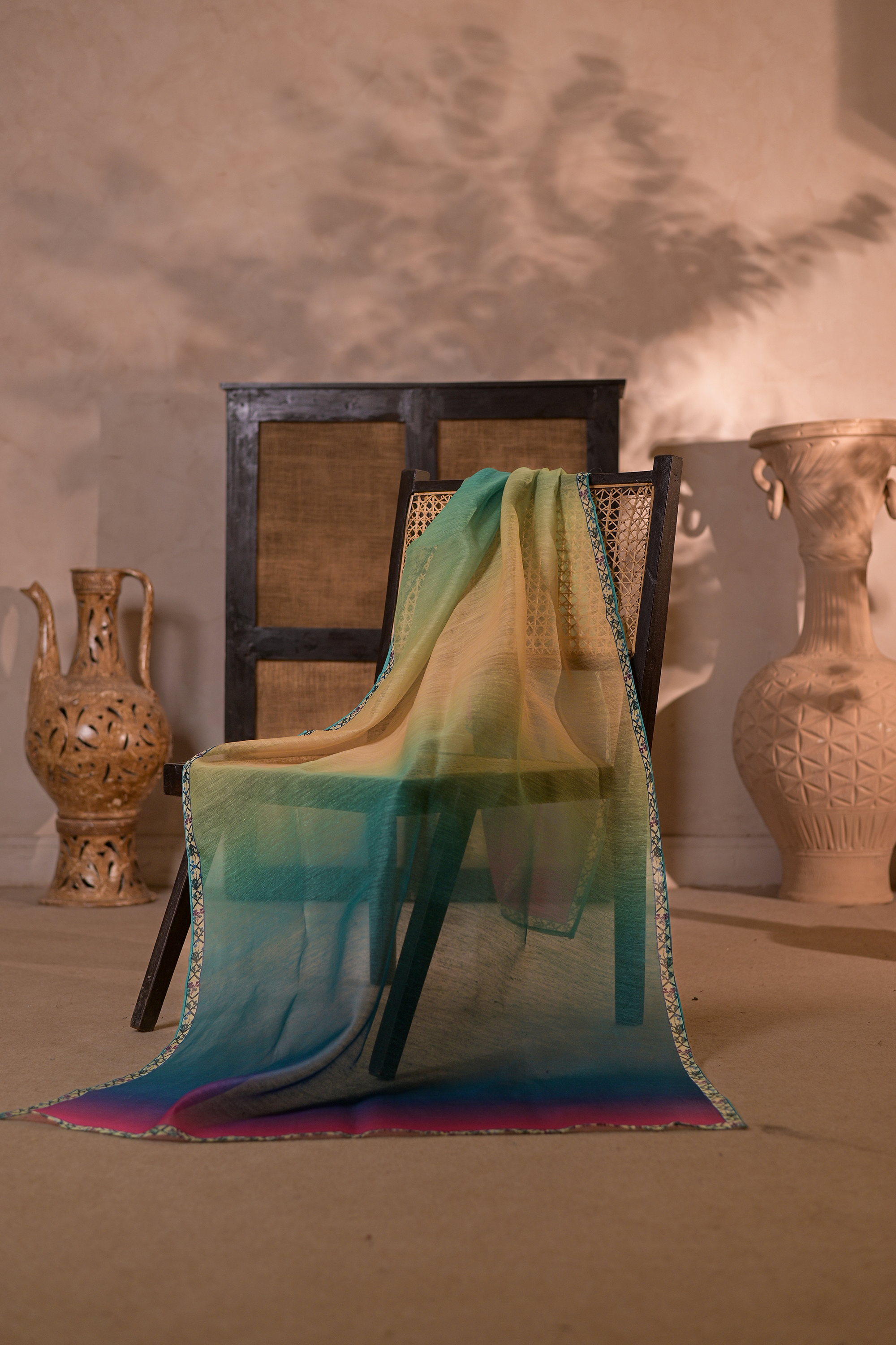 The dupatta features a dynamic ombré dye, creating a breathtaking spectrum that moves fluidly across the material. It begins with rich, warm tones of gold and ochre, gracefully deepening into a lush expanse of teal and aqua, and culminating in a vibrant flash of fuchsia and magenta at the hemline.